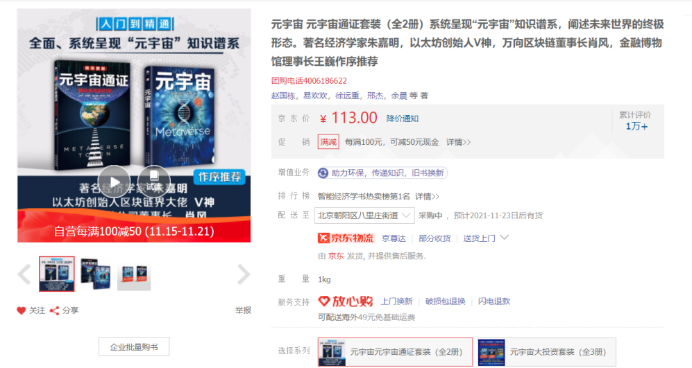 羅振宇賣課之際,有人已經出書了,在京東上,搜索元宇宙,已經能看到《元宇宙》《元宇宙通證》套裝,評價量過萬,宣傳語赫然寫着“以太坊創始人V神推薦”。