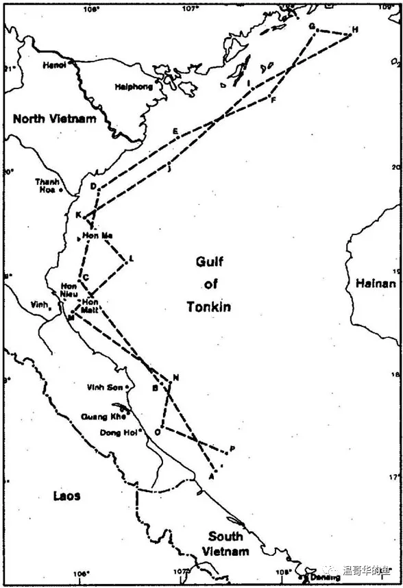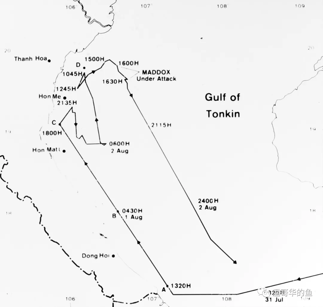 當時美國海軍還在北越近海國際水域不定期開展代號“德索托巡邏”(DESOTO)的秘密偵察行動,出動驅逐艦進行監聽和電子情報蒐集。從1962年到1965年共進行了26次,1964年8月的“德索托”巡邏區恰好選擇在同期展開的“34A”行動區域附近。