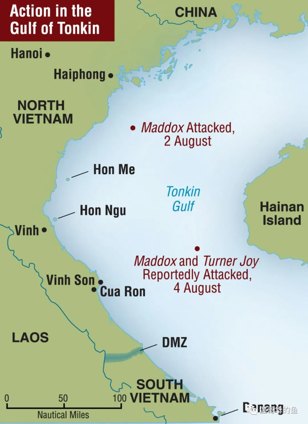 > 上方的紅點為8月2日美越接觸位置,下方紅點為8月4日兩艘美艦報告遭到襲擊的位置