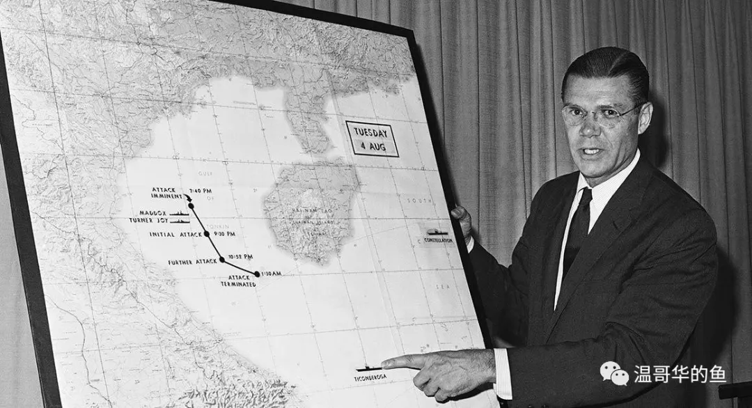> 麥克納馬拉在8月6日於五角大樓舉行的午夜新聞發佈會上説明東京灣局勢,左手指向“提康德羅加”號戰鬥羣位置,右手邊為“星座”號戰鬥羣