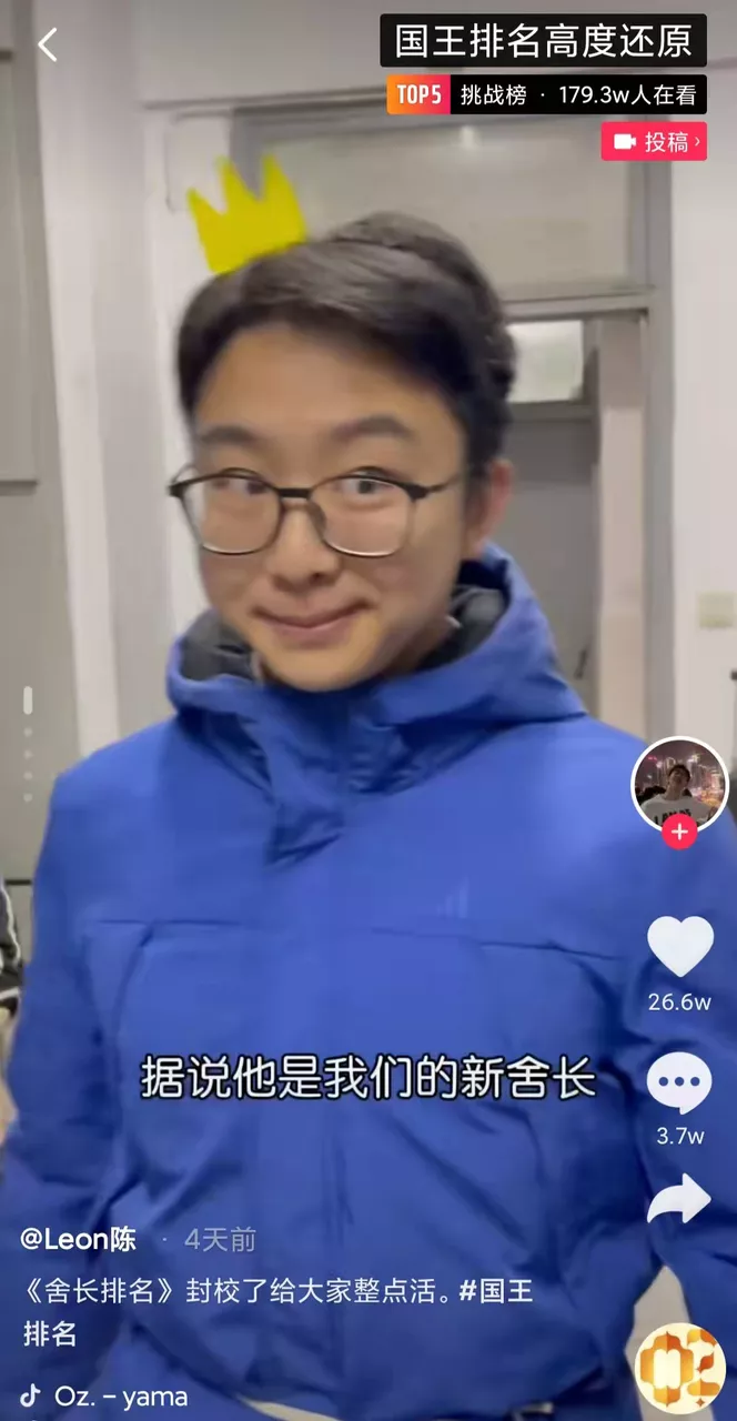 抖音視頻Leon陳的《舍長排名》同樣是《國王排名》的火爆二創視頻。視頻根據《國王排名》指定國王人選的劇情,本土化成了指定舍長人選的劇情,拉近了故事和受眾的距離。主角“吉波”的人物形象更是高度還原了動漫中的”波吉“,標誌性的”V”型微笑,小皇冠,都得到了完美的復原。讓受眾更加了解了波吉的形象特點。網友J.更是評論道“嘴真是靈魂啊”。