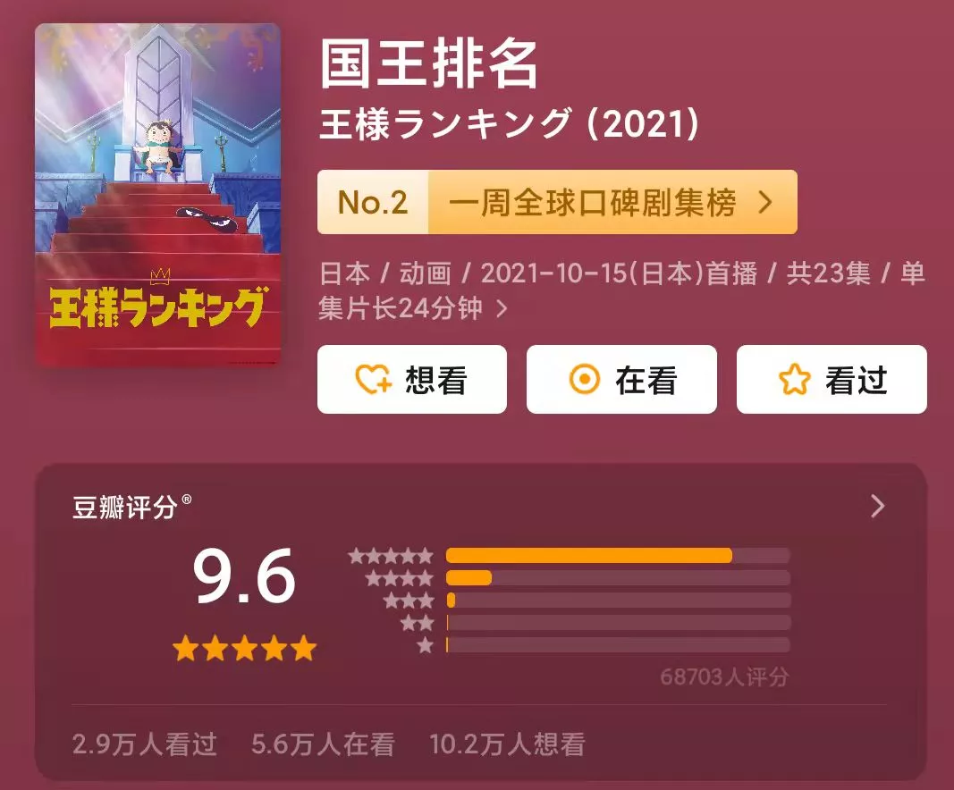 一夜之間,波吉王子的笑臉和各種表情包遍佈朋友圈、微博,無數人苦等更新,在彈幕裏大呼“破防”。截至目前,《國王排名》B站播放量已突破7000萬,508萬“追番”;豆瓣平台上,近7萬人打出9.6的超高分。