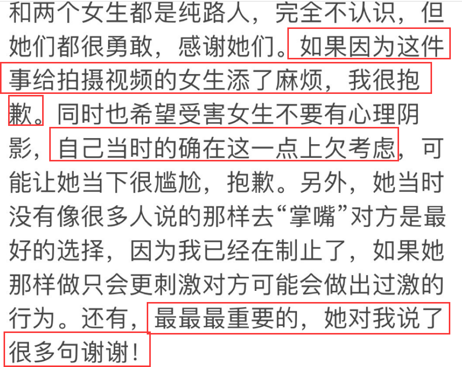 在做了正義的事情後,他還反思自己當時欠考慮了,可能給拍攝視頻的女生添了麻煩,也讓被偷拍的女生尷尬了。