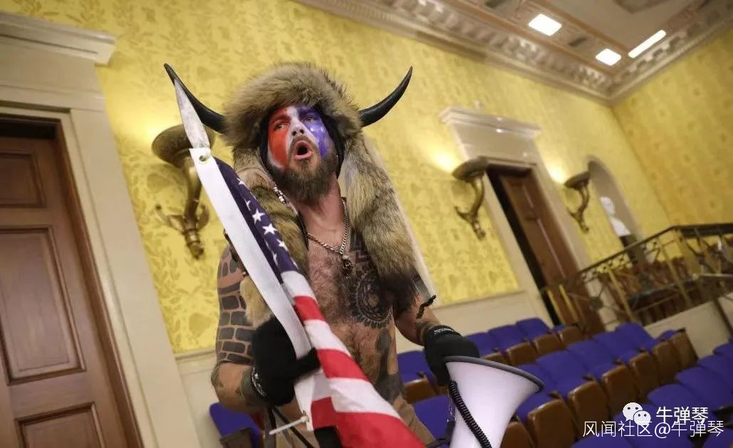 隨後,當副總統彭斯正在國會主持清點選舉人票時,大批“進京勤王”的特朗普支持者,闖入國會山抗議。錢斯利打扮成薩滿形象,頭戴誇張的牛角帽,臉塗成紅白藍三色,赤裸着帶紋身的上半身,在國會大樓裏各種姿勢拍照。
