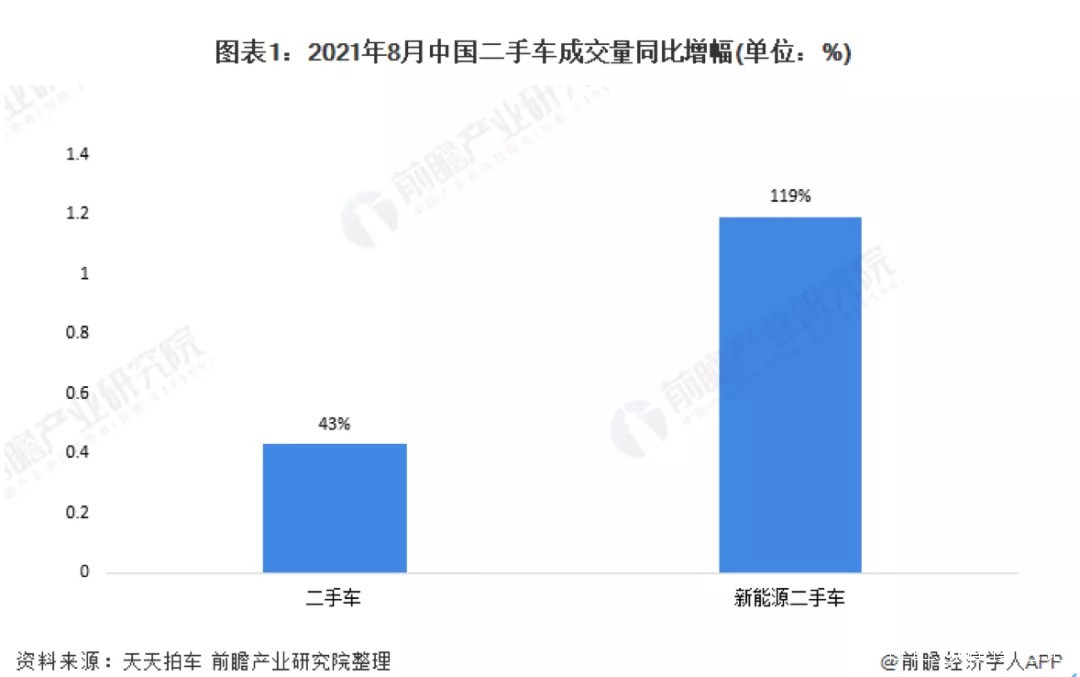 從整體行業的趨勢來看,截至今年6月底,國內新能源汽車保有量已達603萬輛。中國汽車流通協會預計,伴隨着新能源汽車保有量的日益增長,國內新能源汽車二手市場或將迎來高增長階段;第三方機構天天拍車公佈的數據也顯示,2020年新能源二手車成交量較之2019年實現了翻番增長;2021年8月,新能源二手車成交量同比增幅達到了119%。
