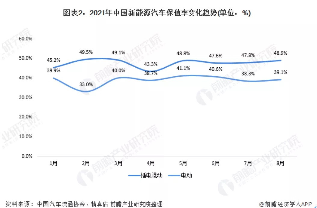 而來自於前瞻產業研究院的報告也顯示,2021年1~8月,新能源汽車保值率趨於穩定,其中,插電混動汽車的保值率在在45-50%之間,而電動汽車的保值率基本在35%以上,保值率趨於穩定將有利於新能源二手車市場穩步發展。