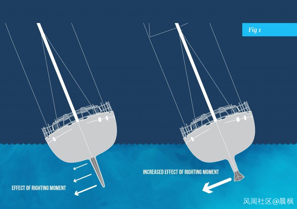 這不是穩定前進方向用的,而是在風浪中在水動力作用下使船體自然回正用的。在風浪中,船會傾斜,水下的“翼面積”產生反作用,實現自然回正。右面的船還增加了沿“翼尖”的凸台結構,“鈎住”水流,減少了水流繞“翼尖”的繞流,增加了回正作用,或者在同樣回正作用要求下,可減少“翼面積”,降低阻力