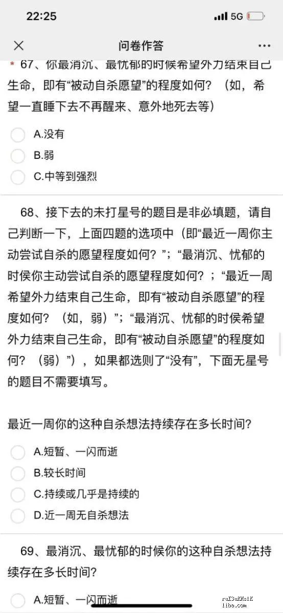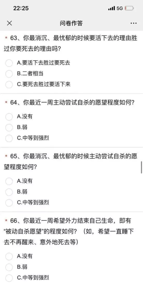 上海長寧區多所中小學的調查問卷中,包含諸多與自殺相關,如“最近一週,為了自殺,你的準備行動完成得怎麼樣?”等問題。