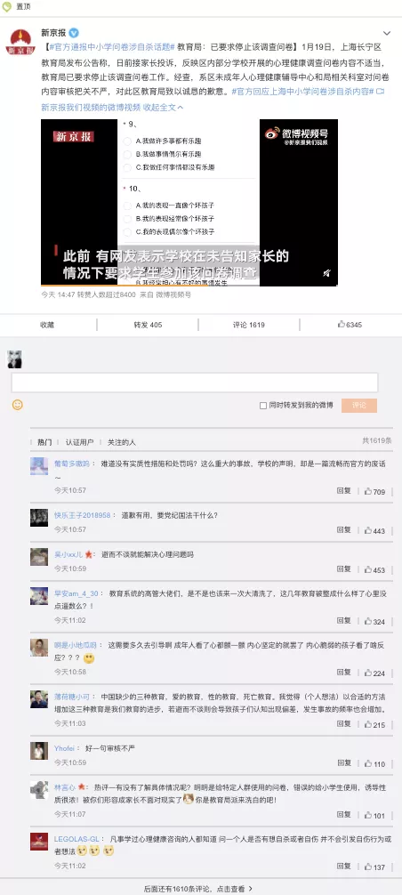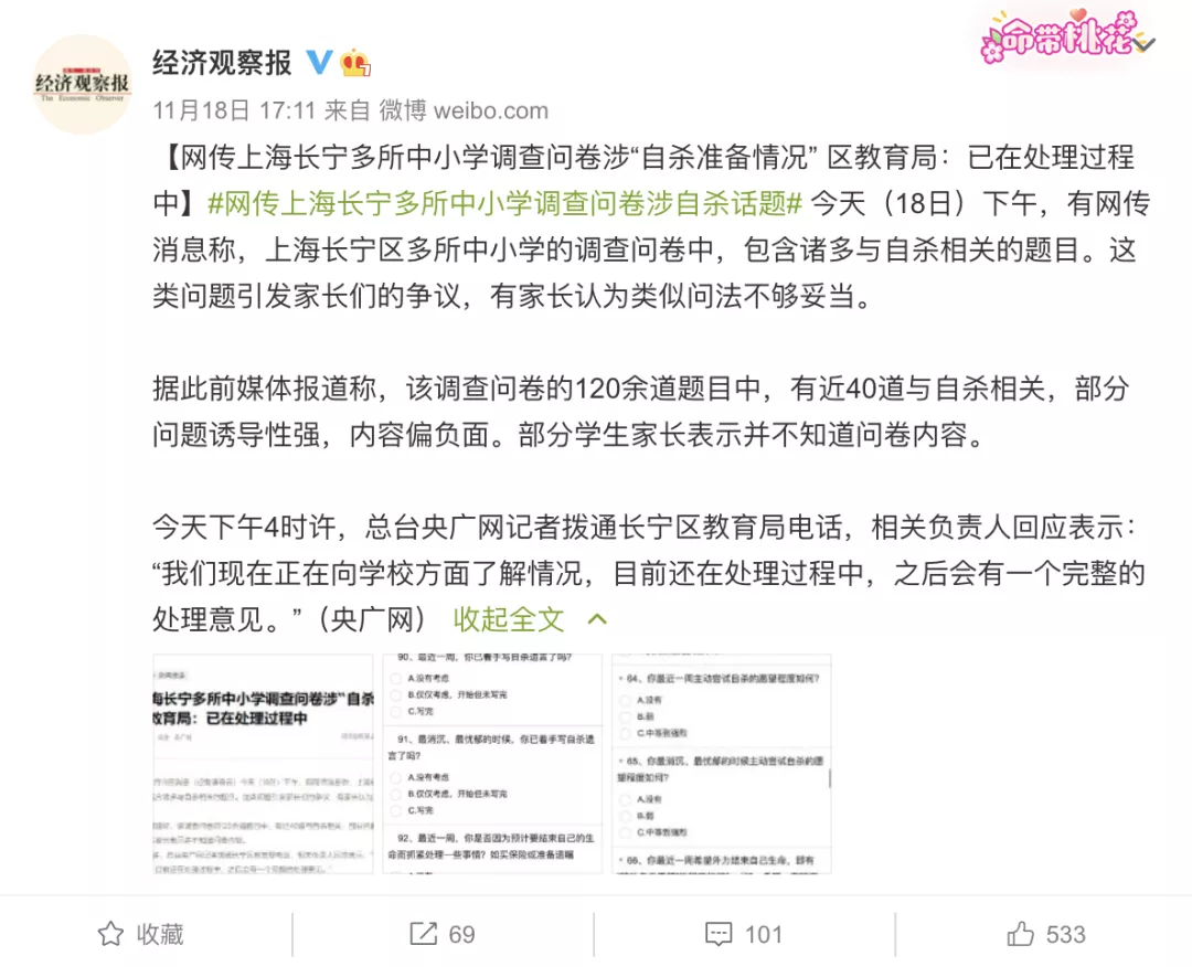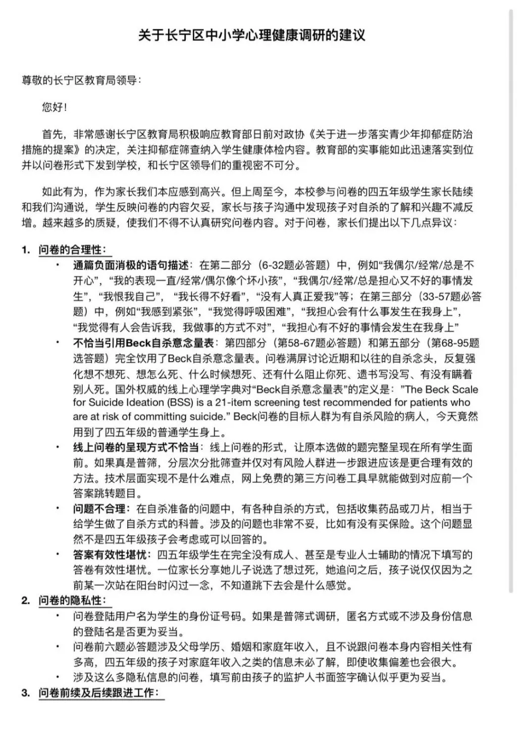 上海長寧區多所中小學的調查問卷中,包含諸多與自殺相關,如“最近一週,為了自殺,你的準備行動完成得怎麼樣?”等問題。