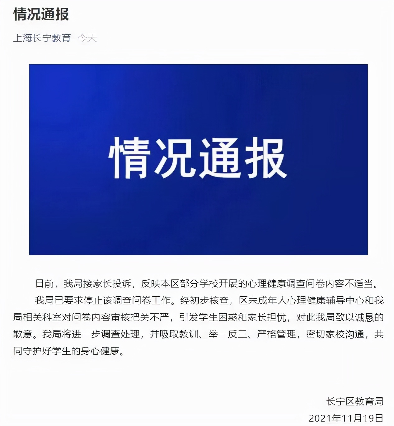 經查,系區未成年人心理健康輔導中心和局相關科室對問卷內容審核把關不嚴,對此區教育局致以誠懇的歉意。
