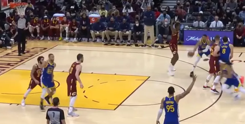 之後的一個防守回合極精彩:加蘭德突李,庫裏和別利察一起補位,加蘭德傳給盧比奧,盧比奧一個精彩的擊地傳球,被別利察輪轉捕到。