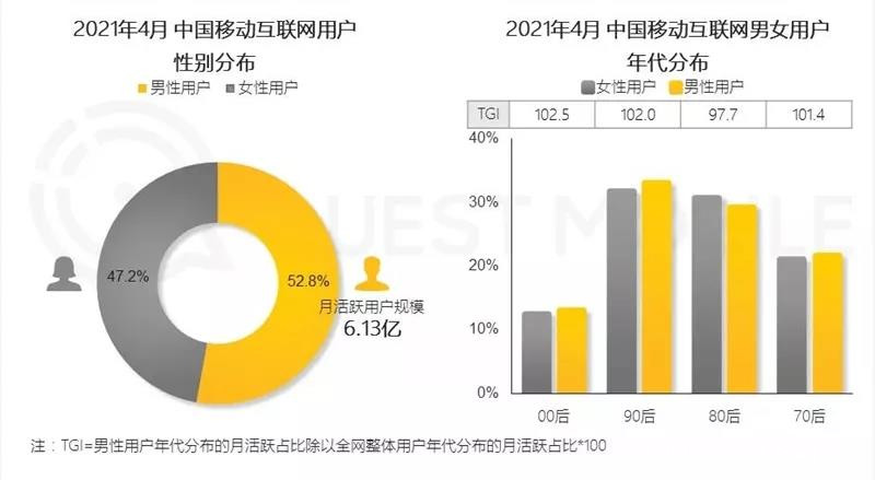 據QuestMobile發佈的《2021男性消費洞察報告》顯示,截止到2021年4月,中國移動互聯網男性用户規模達6.13億,佔比52.8%;男性用户的月人均使用時長超過150小時,高出女性用户20小時。同時,線上消費能力1000元以上的用户已達1.22億,佔比55%。