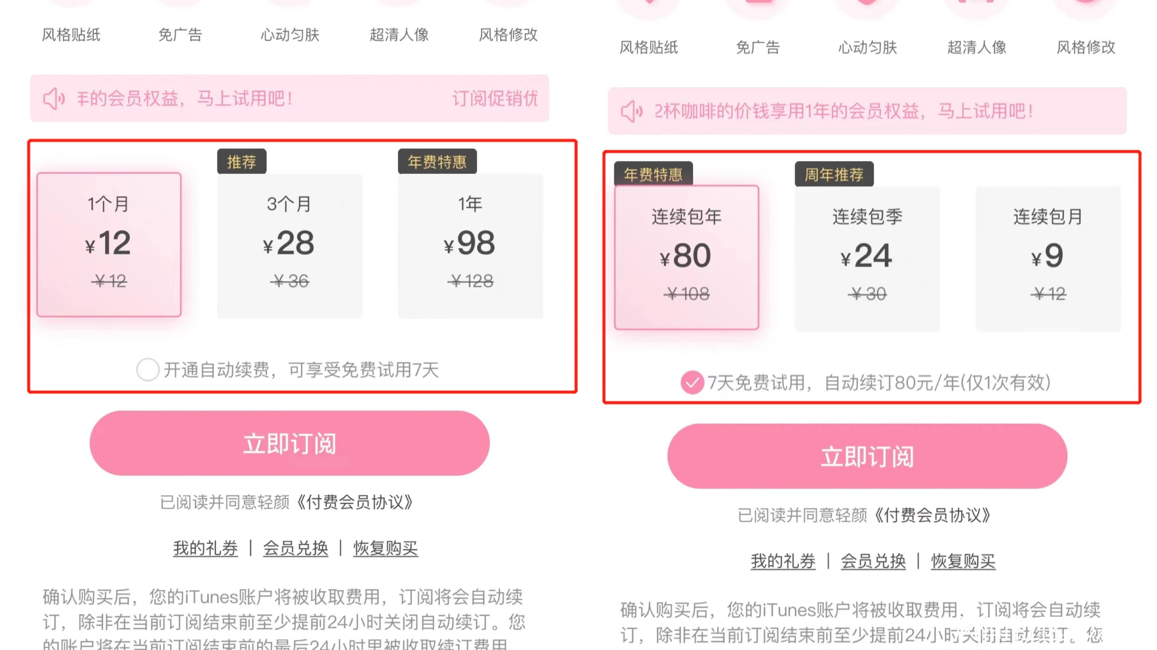 打開輕顏相機,點擊VIP頁面,可以看到收費項目有限連續包年、季度和包月的套餐,默認勾選了自動續費同意條款。根據操作顯示,若不勾選自動續費協議,付費頁面將跳轉到價格較高的付費頁面。