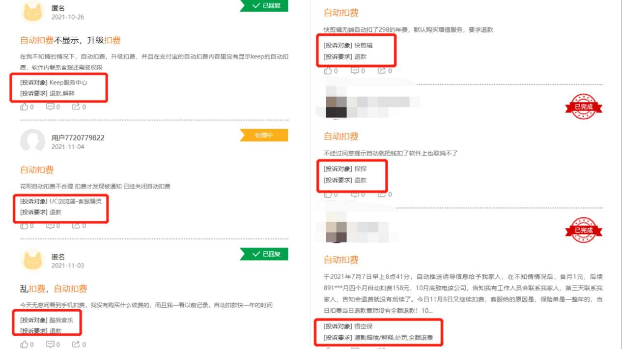 事實上,關於自動扣費的手機APP不止上述幾家,在黑貓投訴上,關於自動扣費的信息,多達81000多條內容,其中涉及KEEP、酷我音樂、拼多多、探探、悟空保等多款應用。