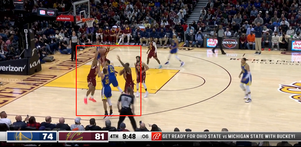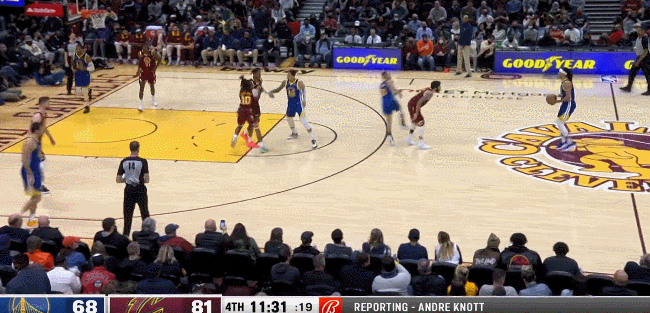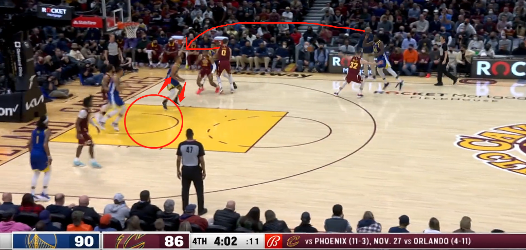 9分51秒,庫裏禁區先是向右一個反跑看似要借別利察的掩護,接近掩護時再向左一個反跑用波特的掩護切出到左側三分線外,弧頂安德森給球,奧科羅和埃德-戴維斯同時撲了出來。