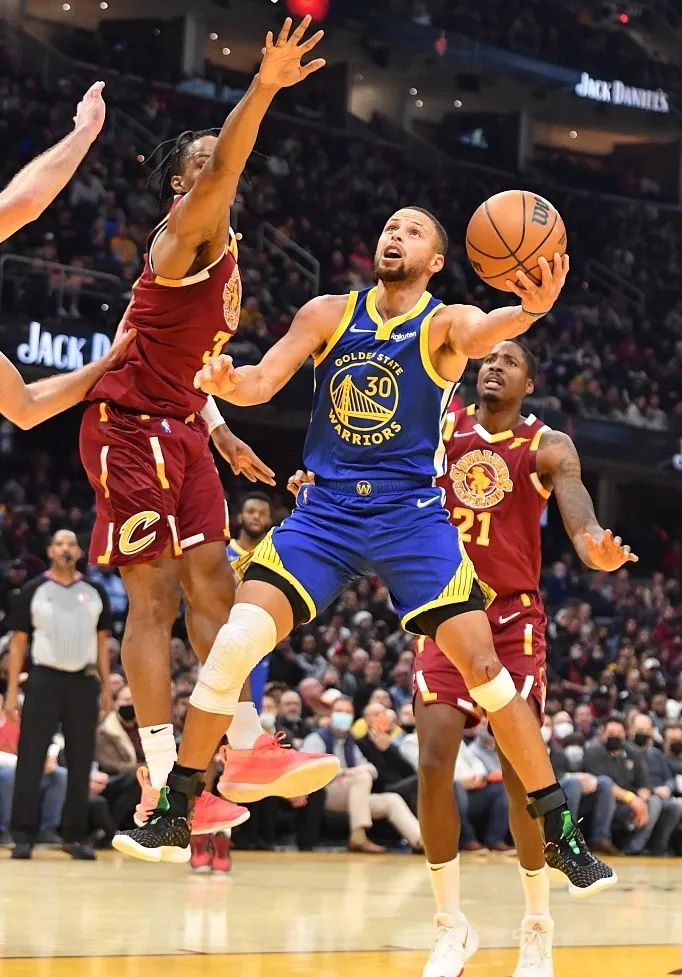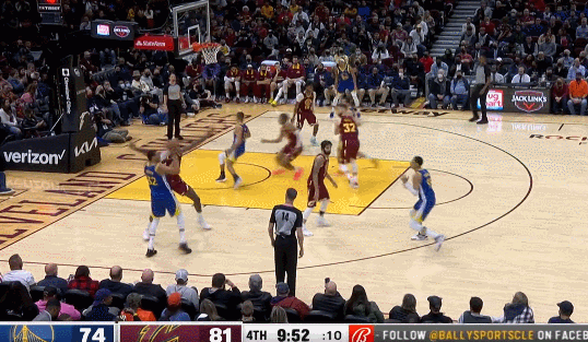 2分50秒,庫裏從左底角切出接球利用雙掩護換成加蘭的防守,持球面對加蘭一記後撤步三分命中。殺人誅心的一球,單場第9記三分球,單節第18分,勇士97-88領先騎士9分。