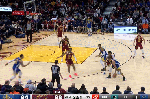 8分35秒,庫裏弧頂走了個假掩護,別利察動都沒動,騎士上線雙人就快撲到三分線外了。庫裏向籃下一個反切接球,再次吸引騎士三人收到籃下夾擊,李右側切入接庫裏傳球輕鬆上籃。