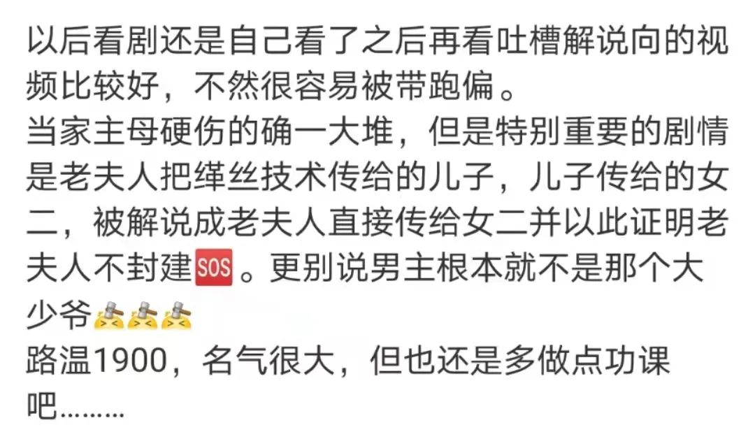 “吐槽視頻都是連劇都沒看就強行吐槽。”成為了不少網友對影視吐槽博主的吐槽。不少博主在只看了一集,甚至一集沒看的情況下,就根據網絡上流傳的截圖、片段製作吐槽視頻,因而出現了許多不瞭解前後設定,斷章取義,槽點與原片情節“驢唇不對馬嘴”的現象。