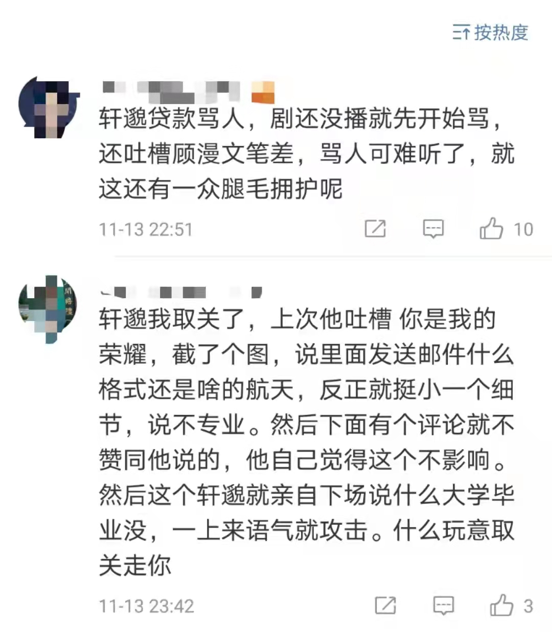 比如網友就曾在微博上指責軒邈“吃相難看”,一邊通過蹭流量漲粉,一邊又陰陽怪氣內涵“飯圈”等等。“劇好不好另説,但專門針對特定明星,譁眾取寵,利用大眾戾氣賺錢,真的很令人反感。”有網友這樣評價。