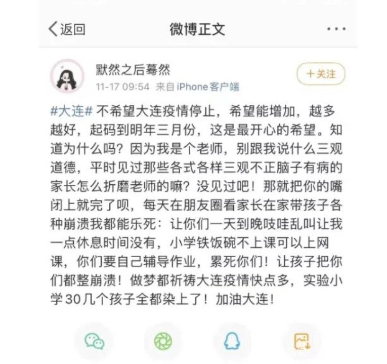 11月17日上午,一位自稱幼師的大連網友“默然之後驀然”發佈微博稱,不希望大連疫情停止、希望越多越好,這引起廣大網友的憤怒。