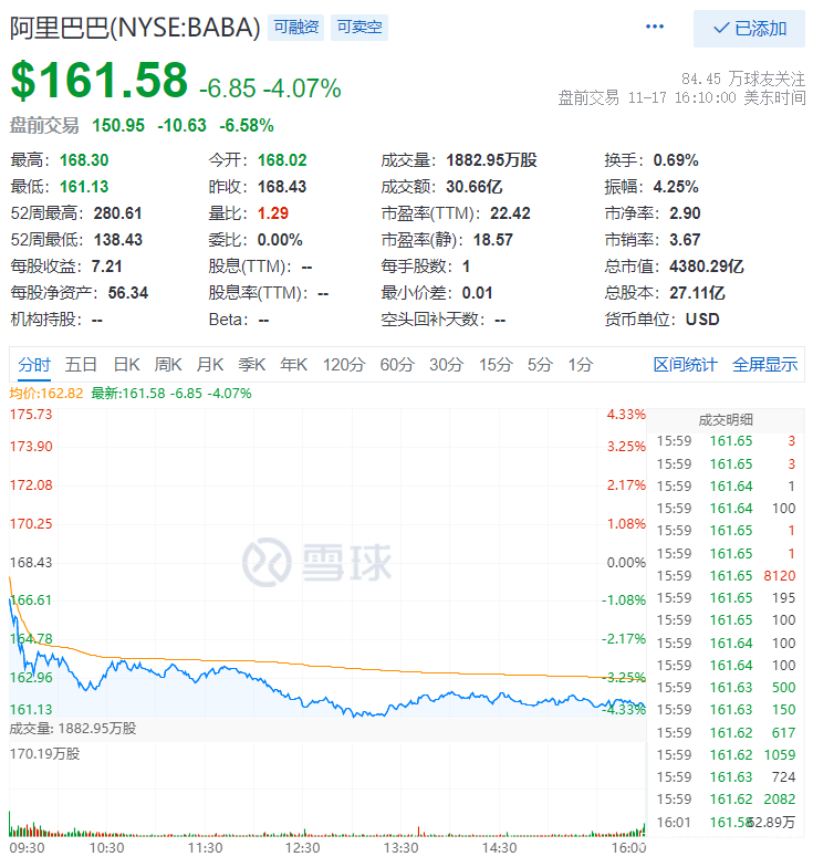 截至發稿時,阿里美股盤前股價已下跌6.5%,市值約為4096萬億美元(人民幣約2.6億元)。