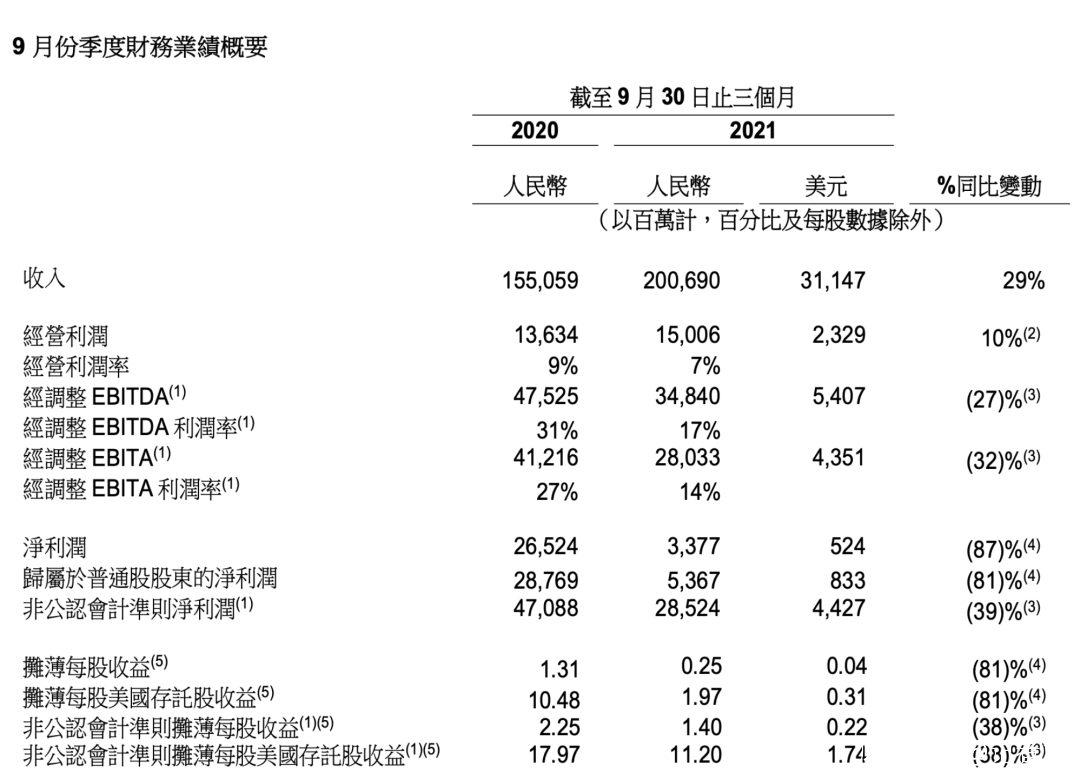 財報提到,截至2021年9月30日的三個月內,阿里巴巴核心商業收入1711.7億元,同比增長31%,經營利潤256億元,同比下滑34%,經調整後淨利潤332.7億元,同比下降27%。