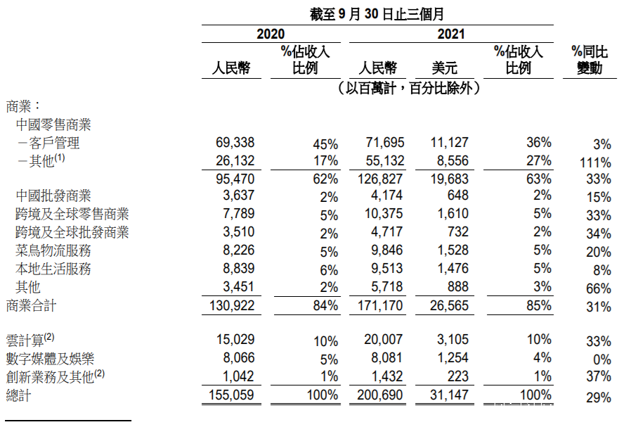 除此之外,中國批發商業、跨境及全球零售、批發、菜鳥物流、本地生活等商業收入的增幅均在2%-5%之間,相對穩定。