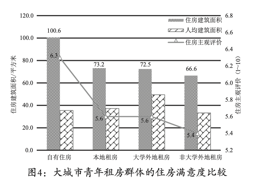 特大城市青年房租客的居住條件如何呢?圖4主要從客觀的住房建築面積和主觀的住房評價兩方面來衡量居住條件。首先,從住房建築面積來看,自有住房羣體的建築面積最大,平均達到100平方米左右,本地租房與大學外地租房羣體相似,都為73平方米左右。非大學外地租房羣體的建築面積最小,平均只有66.6平方米。而從人均建築面積來看,最大的則是大學外地租房羣體,因為這一羣體多為單身或年輕夫妻,人均建築面積達到近50平方米。而其他幾類住房羣體的人均面積差別不大,都為35平方米上下。然而,從住房主觀評價來看,仍存在明顯的差異(住房評價為1~10分,表示由最差到最好)。自有住房羣體的評價最高,均值達6.3分,本地租房和大學外地租房羣體的居住條件相當,都為5.6分,但非大學外地租房羣體的住房主觀評價最低,只有5.4分。概括來説,從客觀住房總面積和主觀評價兩方面,都大體呈現出“自有住房>本地租房≈大學外地租房>非大學外地租房”的差異模式,且最大的差異體現在擁有住房產權的羣體與租房羣體之間。需強調的是,儘管高學歷的大學外地租房羣體往往對住房品質有較高的要求,但當下除了住房面積稍大以外,其對住房品質的評價並不高。
