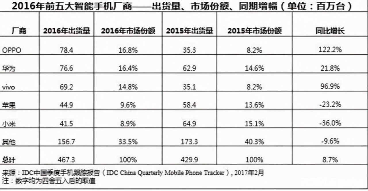 IDC數據顯示,2015年曾登上國內市場智能手機出貨量第一的小米,在2016年滑落至第五位,OPPO、華為、vivo則大幅上漲,超過小米分別位列前三。
