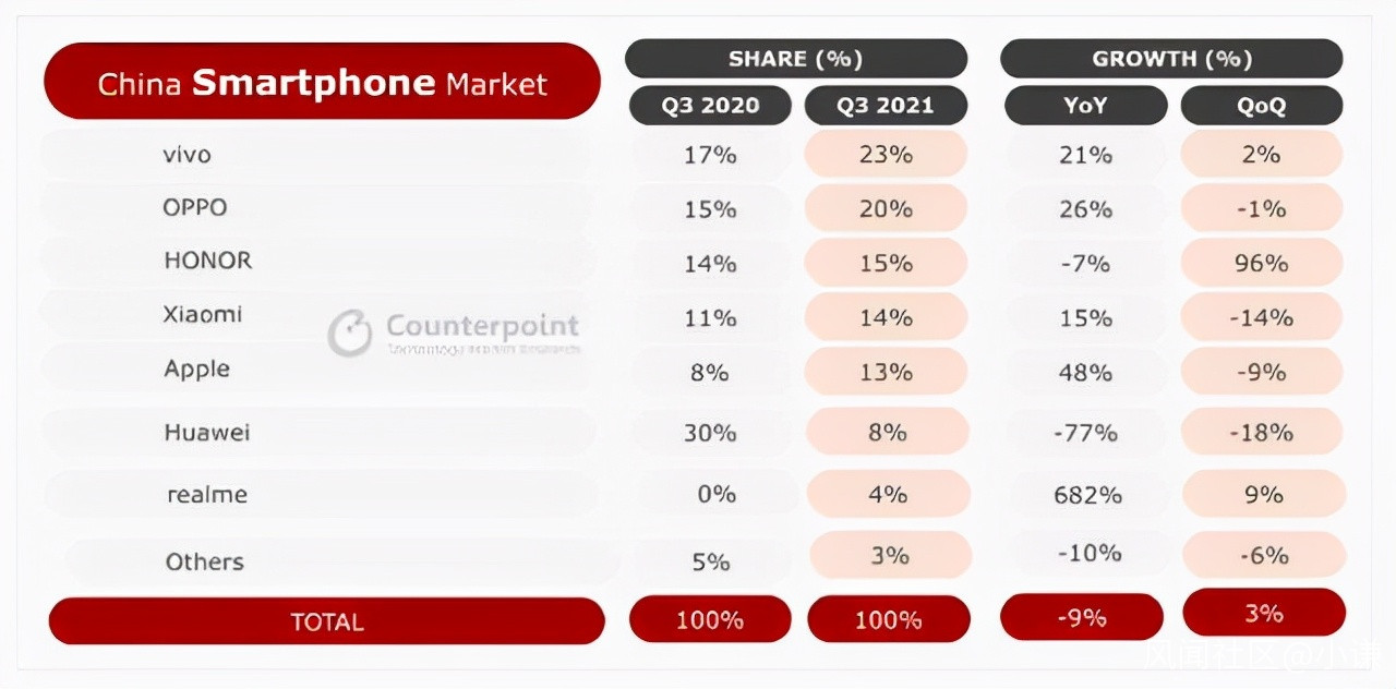 Counterpoint報告顯示,2021年Q3國內智能手機市場中,vivo以23%的市場份額成為第一,排在第二的OPPO則佔據20%的市場,榮耀則以15%的份額超過小米位列第三。