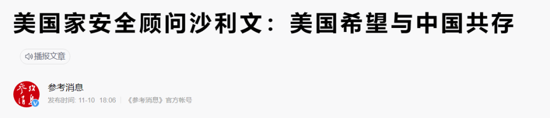 11月10日,美國白宮國家安全顧問沙利文在接受CNN採訪時明確表示,美國正在尋求“與中國共存”,而非遏制中國或者發起新的冷戰。
