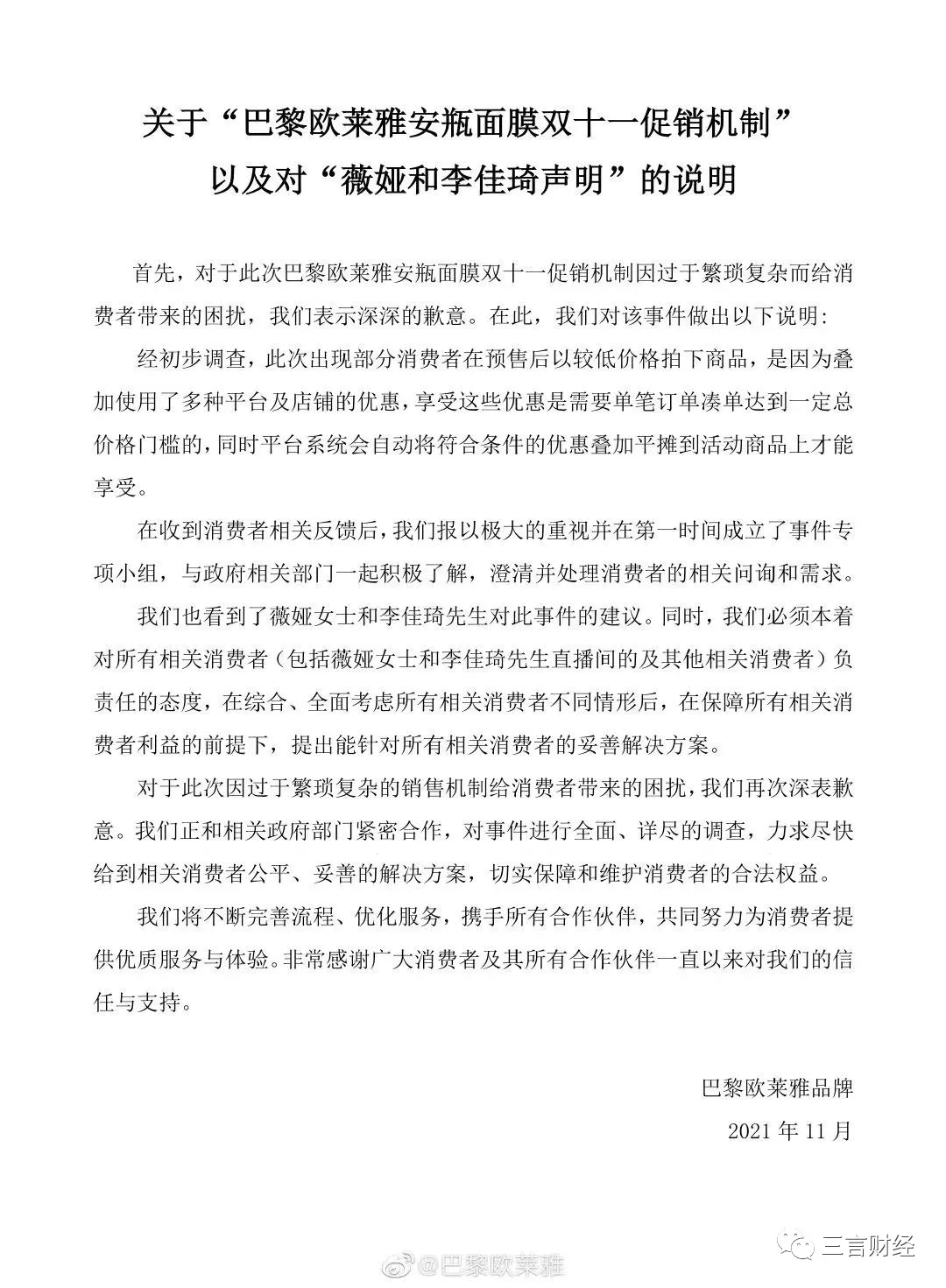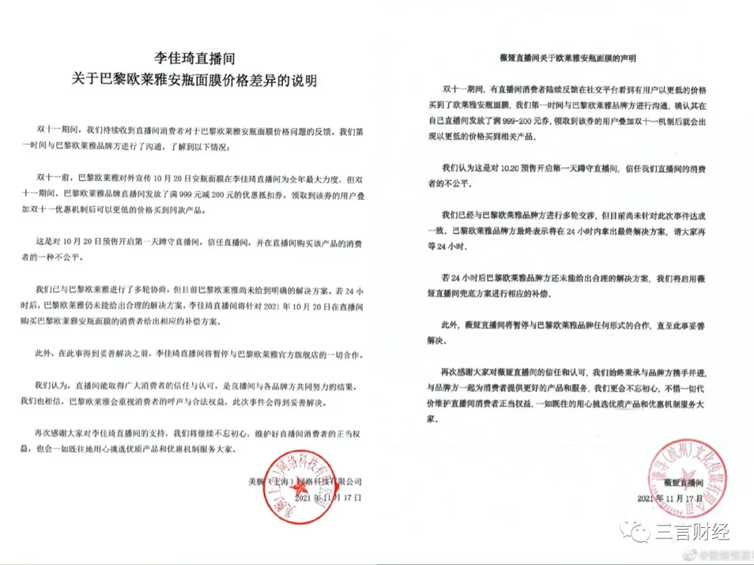 昨日晚間,薇婭直播間與李佳琦直播間針對“巴黎歐萊雅面膜差價”問題發佈聲明稱,直播間已經與巴黎歐萊雅品牌方進行了多輪協商,但是對方並未給出明確解決方法。若24小時後,巴黎歐萊雅品牌方仍未能給出合理解決方案,李佳琦與薇婭直播間將給消費者提供相應補償方案。