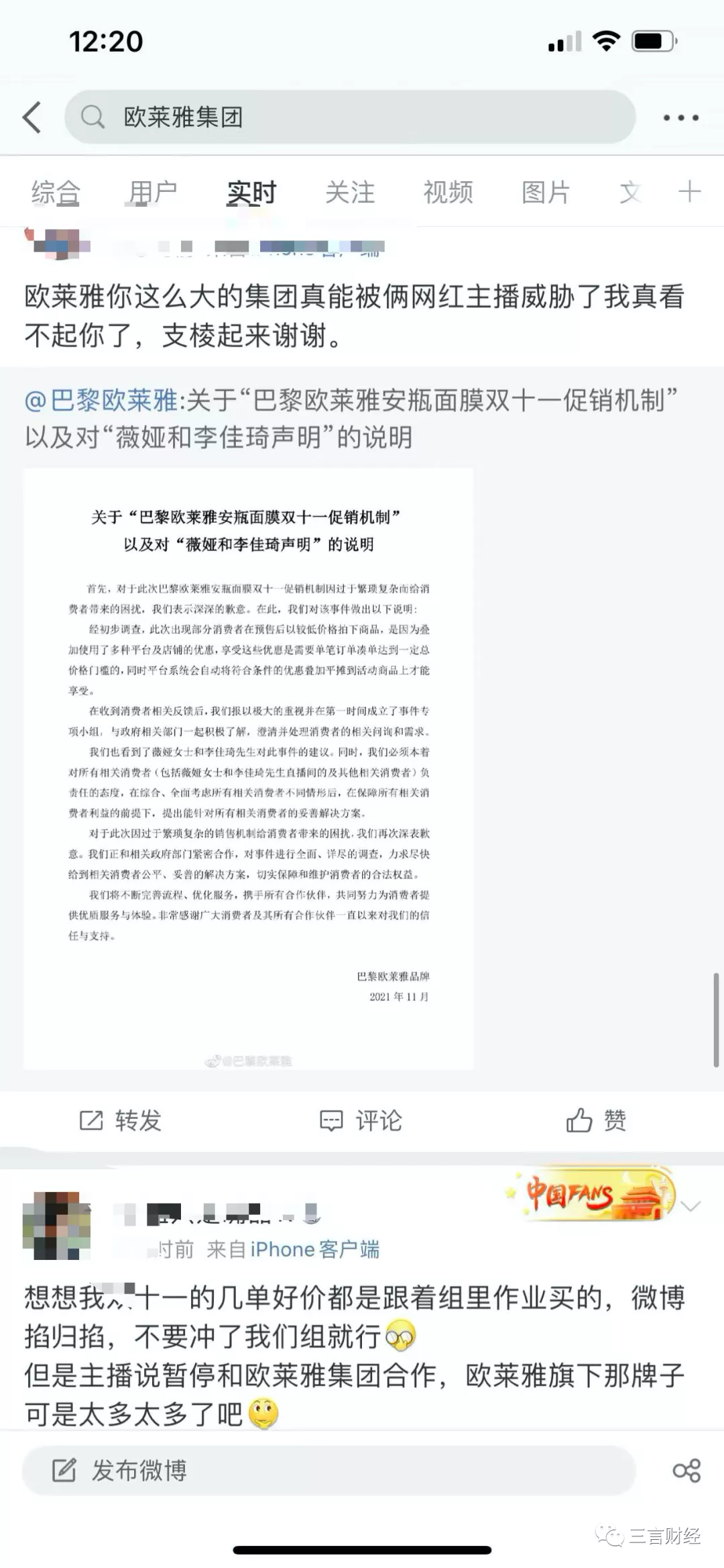 有網友調侃歐萊雅稱,“你這麼大的集團真能被倆網紅主播威脅了我真看不起你了,支稜起來”。