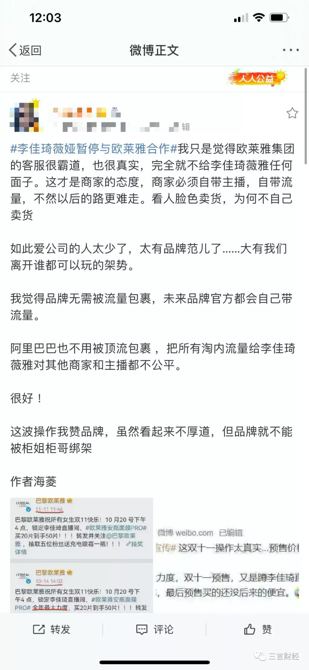 薇婭李佳琦敢不敢“封殺”整個歐萊雅集團?_風聞