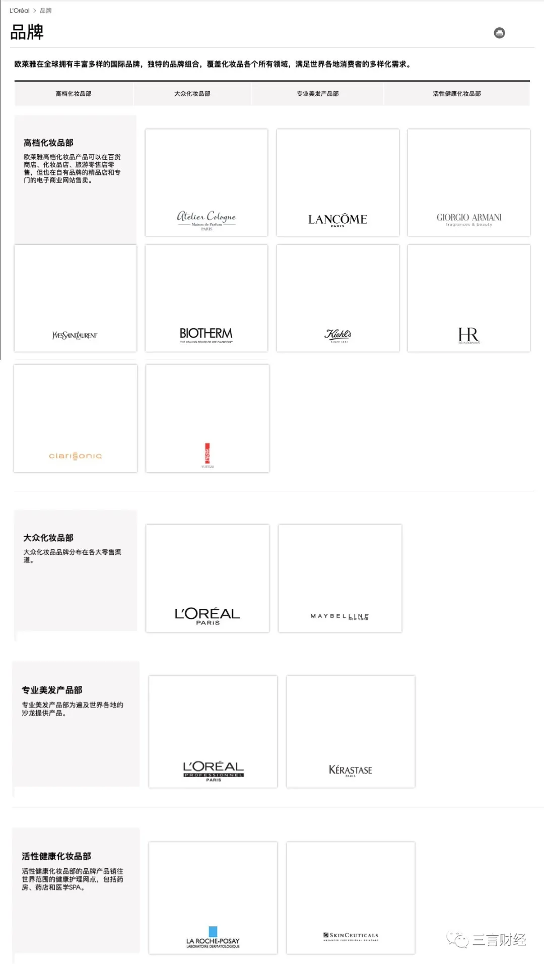 高檔化妝品包括法國歐瓏、蘭蔻、喬治·阿瑪尼、聖羅蘭美妝、碧歐泉、科顏氏、赫蓮娜、科萊麗、羽西等;大眾化妝品包括巴黎歐萊雅和美寶蓮紐約等;專業美髮系列包括巴黎歐萊雅沙龍專屬和巴黎卡詩等;活性健康化妝品包括理膚泉和美國修麗可等。