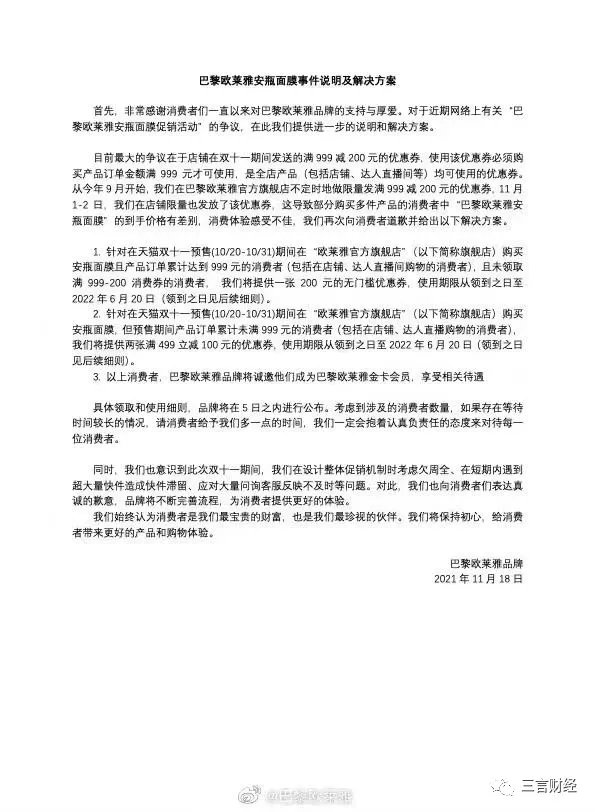 2、針對在天貓雙十一預售(10/20-10/31)期間在“歐萊雅官方旗艦店”購買安瓶面膜,但預售期間產品訂單累計未滿999元的消費者(包括在店鋪、達人直播購物的消費者),將提供兩張滿499立減100元的優惠券,使用期限從領到之日至2022年6月20日。