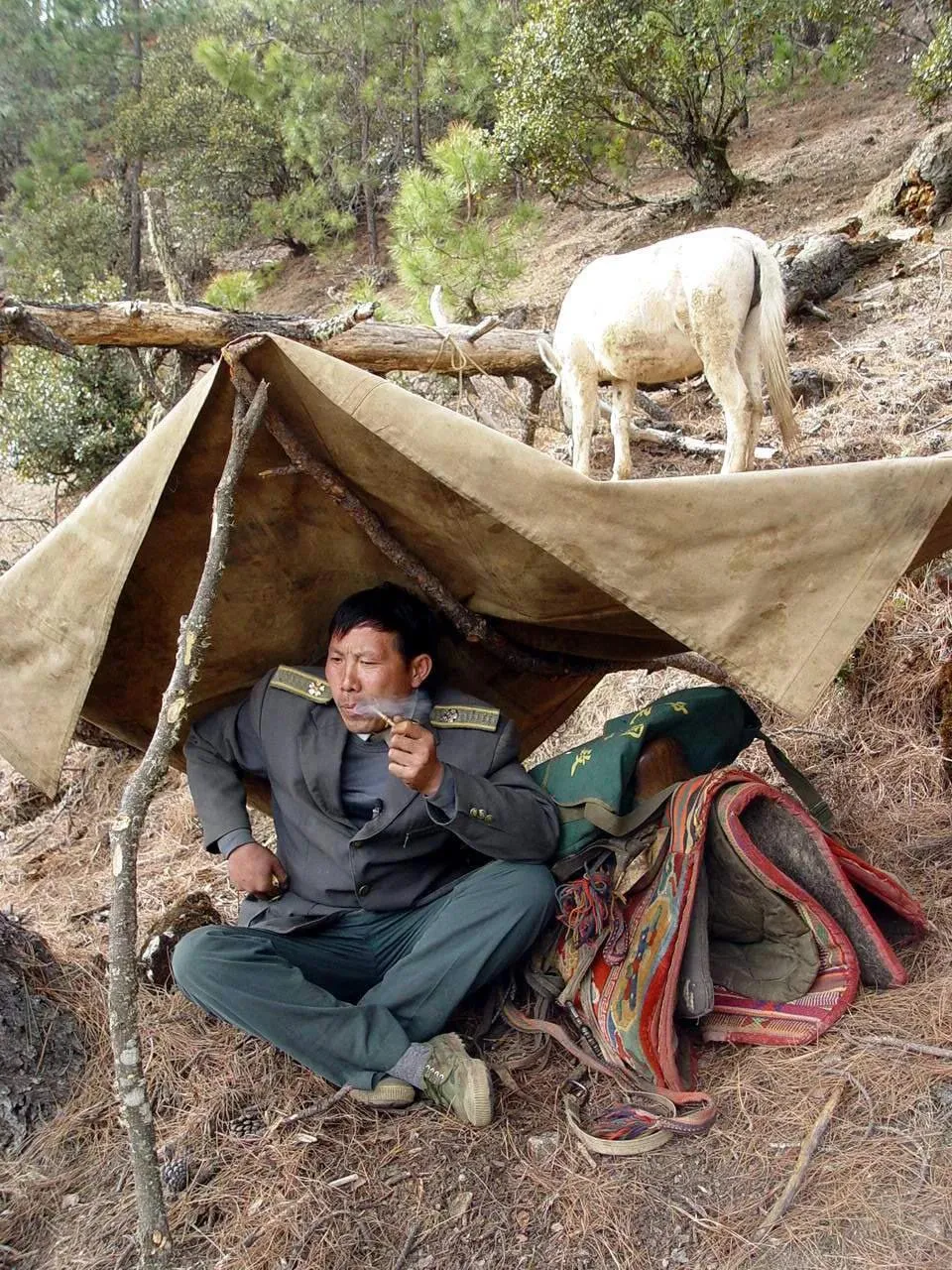 盛夏雨季,身上的衣服總是濕的,原本的石頭路被雨水衝成了一灘爛泥,馬蹄子都不把滑,王順友更是走的連滾帶爬。晚上困了就找個大樹墊塊塑料布,搭個簡易的帳篷睡上一宿。這一路,王順友平均要露宿6晚。