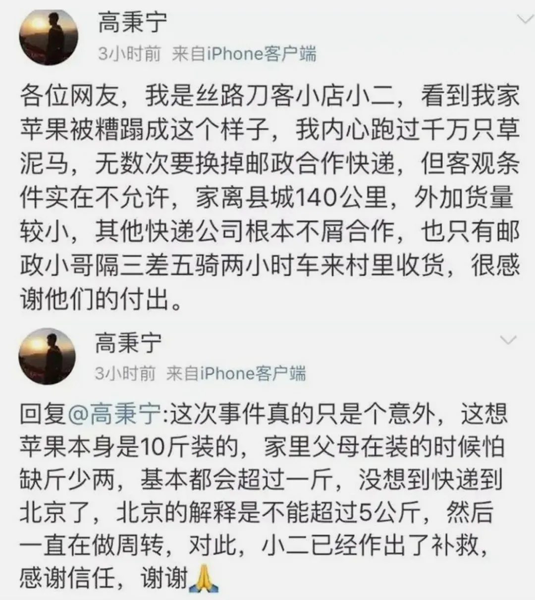 他憤而發博吐槽。收到了眾多網友和大V的聲援。網友一怒之下甚至掛出了蘋果店主的網店,呼籲大家抵制這些發郵政快遞的店家。