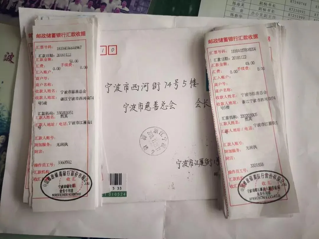 2018年11月22日上午10點半,浙江寧波市慈善總會收到了中國郵政送來的51張匯款單。50張9999元,1張50元,一共50萬元。匯款人的落款是“然其”。