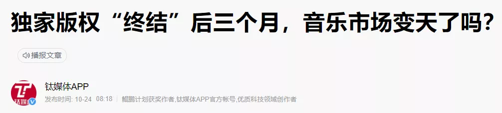 但好巧不巧, 7 月份國家版權局來了一波重拳出擊,對各種獨家音樂版權,還有背後的音樂版權壟斷亂像進行了場整治。