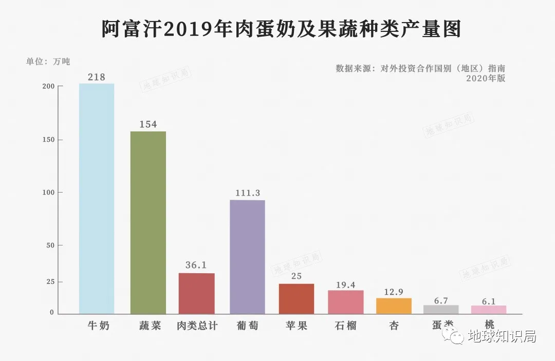 2018年,阿富汗遭遇大規模旱災,三分之一人口糧食難以得到保障。到了2019年,阿富汗風調雨順,便迎來豐收,糧食產量558萬噸同比增長35%。收穫了約111.3萬噸葡萄,而排名第二位的水果蘋果便降至25萬噸。各類蔬菜總量僅有154萬噸。各種肉類更是僅有36.1萬噸。唯一亮眼的產量便是奶類,產量高達200萬噸。