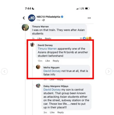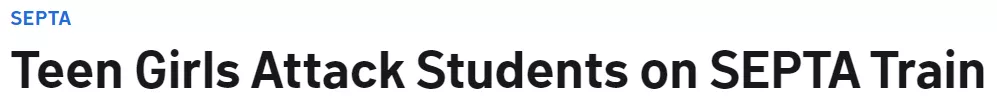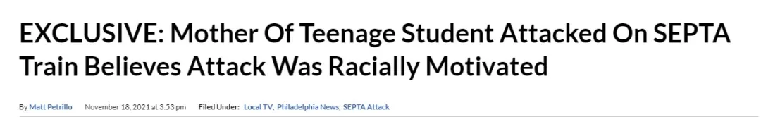 11月17日,在費城地鐵SEPTA)發生一起暴力事件,多名非洲裔青少年女子在費城捷運列車上辱罵毆打一羣亞裔學生,口出種族歧視語言,更將其中一名女學生暴打在地反覆拳打腳踢。