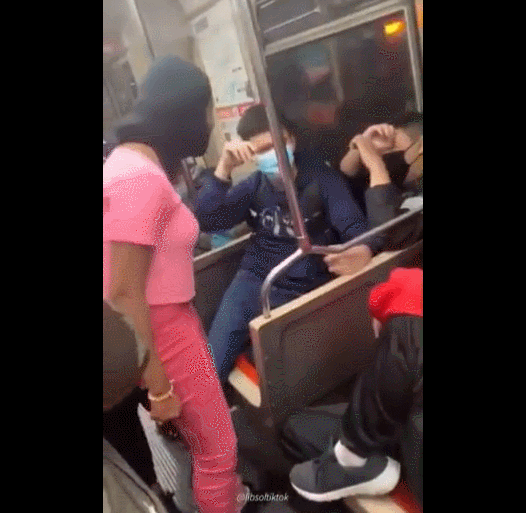 視頻一開始,只見一個身穿粉色緊身衣+黑色頭巾的非裔女子,站在一旁朝一羣亞裔面孔的男生破口大罵,**不時地大吼“F**king China”和“China Chicken”**等歧視性詞語。