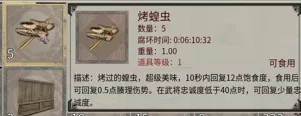 攢滿四隻蝗蟲,你就能在篝火裏做出一串香噴噴嘎嘣脆的蝗蟲美餐,食用一份能在10秒內恢復12飽食度。