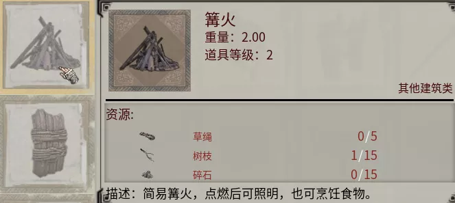 在遊戲前期你要搭建第一個篝火,需要十多塊碎石加上十多根樹枝,初入遊戲時我發現自己不知何時變得飢腸轆轆,眼前一片模糊,才醒悟過來該做點吃的,這時候,合起來一共需要蒐集三十多份材料,顯得造篝火的小目標一下子沉重起來。