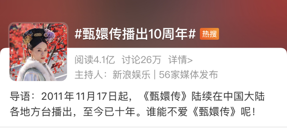 很難想象《甄嬛傳》已經十年了,“甄學家”活躍在互聯網的每一天裏,《甄嬛傳》的播出彷彿還在昨天。很少有人記得,在以電視機為主流的影視時代中,《甄嬛傳》並不是一部播出就爆紅的“爆款”,但他持續十年的影響力則是國產劇中難得一見的。