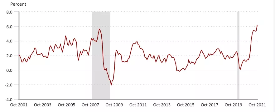 11月10日,美國勞工部發布10月經濟數據顯示,該月消費價格指數(CPI)與去年同期相比增長了6.2%。這創下了1990年以來最高增值。