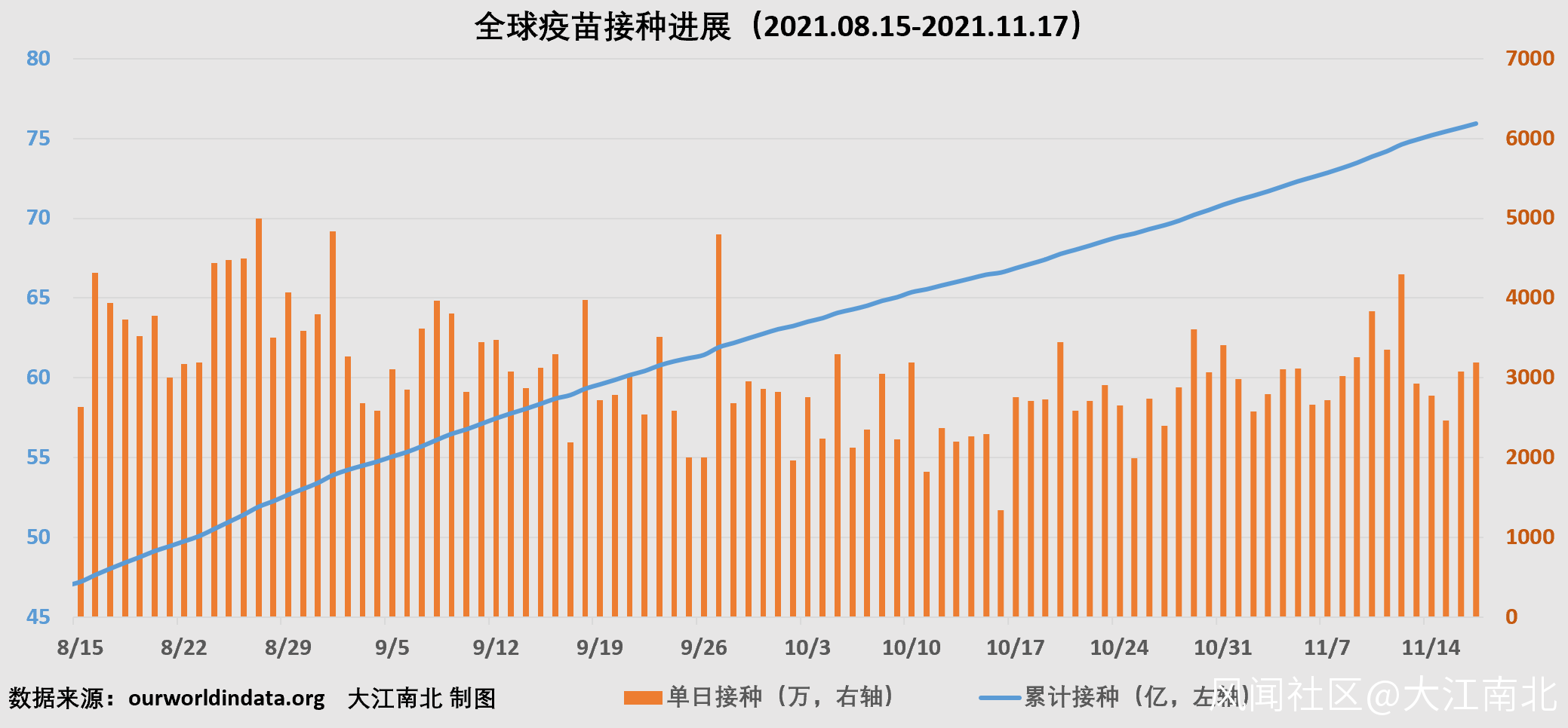 截止2021年11月17日,全球累計接種新冠疫苗75.95億劑;其中單日接種3193萬劑;平均每百人接種96.44劑,環比增加0.32劑。