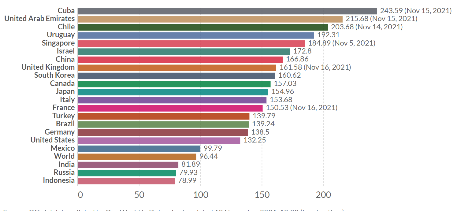 世界主要大國**+**部分小國每百人接種劑次(2021.11.17)