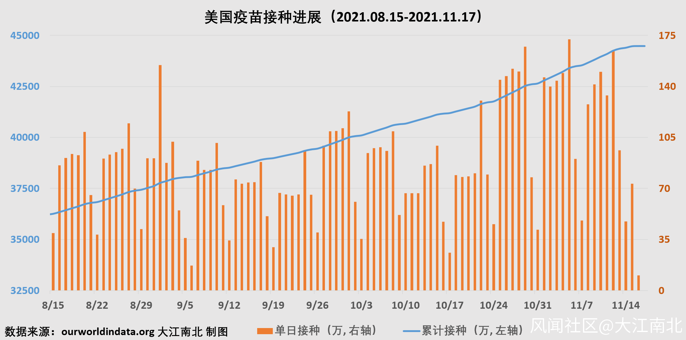 截止2021年11月17日,美國累計接種4.4479億劑,居全球第三位;美國每百人累計接種132.24劑,比中國低38.45劑,是中國的77.5%。